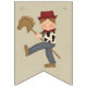 Fun bunting banner has a brown haired cowboy on either end and says Happy Birthday with a Sheriffs badge between the words. The cowboy is wearing his blue jeans, a cow print shirt, red bandanna and a red cowboy hat and he's riding his toy pony. This will be such a cute decoration at a cowboy party! Also available in blonde haired cowboy and an Asian cowboy.