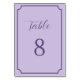 Wedding table number card in lilac tones with dark lavender lettering in serif and script fonts inside a frame