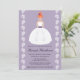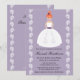 Customise and personalise this pretty bridal shower invitation with a lilac textured background and a pretty, redhead bride in a strapless wedding gown with a plum sash and pretty flourish pattern on her skirt. She wears a flower in her hair and accessorises with a lovely pair of tear drop shaped dangle earrings. Illustration and artwork © Chrissy H. Studios, LLC. All Rights Reserved.