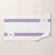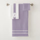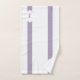 Your initial displays in lilac over a white matting and matching lilac vertical stripes on both ends of the hand towel. The bath towel has double white horizontal stripes at each end over a lilac background and the wash cloth is solid lilac . Artwork and design by Karlajkitty