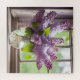 Purple lilacs in old glass vase on wooden window sill in farmhouse