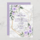 Modern and trendy, this pretty wedding Save the Date card design features a faux gold geometric embellished with lilac lavender purple florals, dusty blue green watercolor greenery, and features trend hand lettering. Part of a matching wedding suite. Copyright Elegant Invites, all rights reserved.