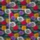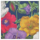 This is a colourful watercolor pattern of multicolored lilac, red, white and yellow poppy flowers with green leaves on a navy blue background.