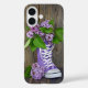Lilac bouquet in purple high top sneaker on rustic barn wood.