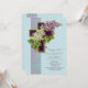A beautiful heirloom image of a wooden cross with white and lavender lilacs. The cross rests on a blue and pink check ribbon and a blue background. A sophisticated religious invitation.