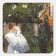 Vintage 19th century image of woman in white carrying her baby wearing a confirmation gown through the flowers. Fine art by Russian artist Boris Kustodiev.
