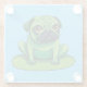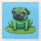 Cute green Pug resembling a frog sitting on a lilipad. Background colour can be changed.