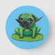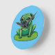 Cute green Pug resembling a frog sitting on a lilipad. Background colour can be changed.