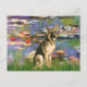 Water Lilies by Impressionist Claude Monet (1914), adapted to include a German Shepherd. One of many water lily paintings, this one has red or bright pink lilies in the pond. It sold at auction in 2008 for over 70 million.