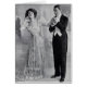 English Edwardian actress Lily Elsie scene in "Summertime" production. Her suitor holds her hand as she leans away with a flirty look. Vintage black and white photograph in public domain.