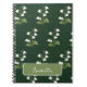 Journal spiral notebook with a pattern of hand illustrated white flowers named lily of the valley. These are pretty bell shaped white flowers and make a pretty cover for your custom personalised notebook!