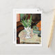 A fine art postcard with the painting, Bouquet of Lily of the Valley in a Vase (1931) by Suzanne Valadon (1865-1938), A still life depicting a grouping of lily flowers in a white ceramic vase next to a glass bowl of oranges.
