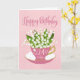A quaint little pink teacup filled with a beautiful bunch of lily of the valley flowers along with the hand lettered words Happy Birthday on the top of card and the hand lettered words 24 today with love hearts on the tea cup. A sweet birthday card for someone special turning 24 today!