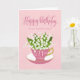 A quaint little pink tea cup filled with a beautiful bunch of lily of the valley flowers along with the hand lettered words Happy Birthday on the top of card and the hand lettered words 71 today with love hearts on the tea cup. A sweet birthday card for your aunt turning 71 today!