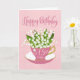 A quaint little pink teacup filled with a beautiful bunch of lily of the valley flowers along with the hand lettered words Happy Birthday on the top of card and the hand lettered words 73 today with love hearts on the tea cup. A sweet birthday card for someone special turning 73 today!