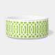 Cute customised cat or dog food bowl with a lime green imperial trellis pattern and rectangle frame placeholder for your beloved pet's name.