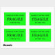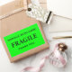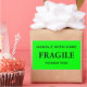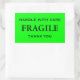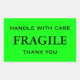 Stickers with: Fragile. Handle with Care. Thank you. Black text on a lime green background. Personalise with your information using the easy templates. Font colour, font style, font size, and lime green background colour are customisable.