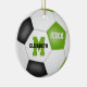 This kids soccer themed ornament features a soccer ball graphic upon which you can customise the athlete's name, monogram and commemorative year - some of the typically black panels of the soccer ball graphic have been recolored lime green - by katz_d_zynes