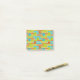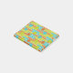 This Post-It notepad has a mid-century modern design of repeating rectangles in lime green, cinnamon brown, and turquoise with circles layered on top.