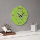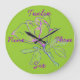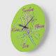 Wow ... Lime green clock with purple lettering and purple drawing of a rose in the middle. This clock is not for the weak design crowd but for those who boldly go forward with lime green and purple colours in their dreams.