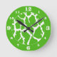 This animal print clock features a lime green and white giraffe design. The outer ring has white numbers to mark the hours. The larger numbers mark each quarter hour.