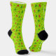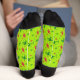 These socks are perfect for Christmas! They feature illustrations of skiers doing ski tricks along with snowflakes accents in festive red and green set against a bright lime green background.