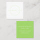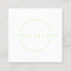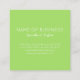 Square business card in a clean design in lime green and white.