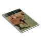 A notebook with a photo of a golden brown limousin cow with horns, licking it's calf, while the calf is licking his own nose.