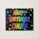This exciting, lively, birthday-themed jigsaw puzzle design has the message "HAPPY BIRTHDAY, LINDA" with the characters having a colourful rainbow spectrum inspired gradient pattern, along with a vibrant field of stars background pattern. A vibrant puzzle like this might be a fun way to acknowledge the birthday of somebody named Linda. [~Z0000468]