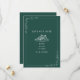 Illustration of rustic barn with line art botanical border. Background is dark emerald colour.