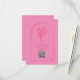 Wedding RSVP with bouquet illustration with botanical arch border. Background is pink. Artwork and text are red.