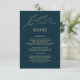Creative and trendy wedding design featuring a hand-drawn line art gold twig with leaves. Deep blue background. Truly unique, modern, and elegant. For fall wedding, summer wedding, garden wedding, or any kind of modern elegant wedding.
