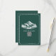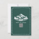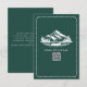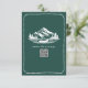 Wedding RSVP with mountains and evergreen and canoe illustration with scalloped border. Background is emerald. Personalise the text and QR code.