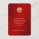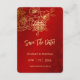 This traditional Chinese wedding safe the date card features a gold cherry blossom line art branch and a gold double happiness symbol on a shimmering red background. With a "save the date" title in an elegant handwritten script and a custom text in a modern sans serif font.