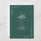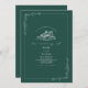 Illustration of barn at top with line art botanical border. Background is emerald green colour.