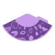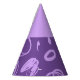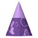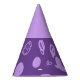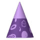 This paper party hat features a fun design based on circular lines, artistic spots and flat polka dots in lilac on a purple background. The upper part is the same colour as the print.