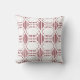 This throw pillow has a mid-century modern design of cranberry vertical lines with hexagons strung horizontally on a field of white.