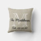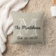 Personalised black and white text monogrammed pillow with family name and wedding date in a typography overlay design on your last name initial and a PRINTED beige linen photo effect background. Linen Look Custom Family Monogram Pillow. Elke Clarke© for MonogramGallery at Zazzle. Makes a great gift for newly weds with a rustic wedding theme. Great for your bedroom, favourite chair, as fun decor in your family room or formal decorative addition to your living room.