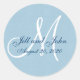 Blue Linen Monogram Wedding Initial Bride Groom Favour Sticker or for Wedding Invitation Envelope Seals. Fully Customisable. Elke Clarke©2009. Other colours available in our store MonogramGallery at Zazzle. Printed photo effect beige linen background with white monogram and navy blue script text. Perfect for a rustic wedding theme.