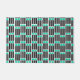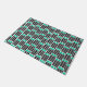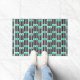 This doormat has a mid-century modern design made of five black lines and two turquoise rectangles repeated across the design.