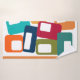 This towel set has a mid-century modern design of lines and rectangles in retro shades of orange, gold, cranberry, teal, green, blue, turquoise, and green.