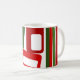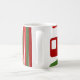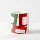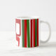 This mug has a mid-century modern Christmas design of lines and rectangles in retro shades of red and green.