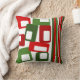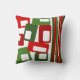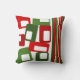 This throw pillow has a mid-century modern Christmas design of lines and rectangles in retro shades of red and green.