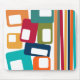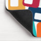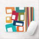 This mouse pad has a mid-century modern design of lines and rectangles in retro shades of orange, gold, cranberry, teal, green, blue, turquoise, and green.