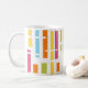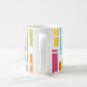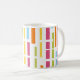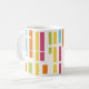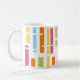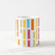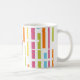 This mug has a mid-century modern design of colored vertical lines with white horizontal lines.