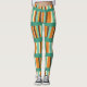 These leggings have a mid-century modern design of horizontal lines made from vertical stripes in seafoam, off-white, two oranges, and brown.