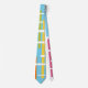 This tie has a mid-century modern design of coloured vertical lines with white horizontal lines.
