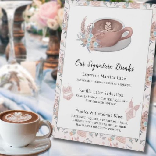 This Lingerie & Lattes bridal shower invitation showcases elegant wedding lingerie, a cosy latte, and boho florals, creating a charming and stylish design. The back features a beautiful bridal shower pattern with wedding cakes, delicate lingerie pieces, florals, and more, adding a whimsical touch.
