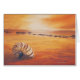 Warm, golden hues indicates that the evening sun is setting. Without any single person, there is only a giant shell left on the beach, as if it is listening the whisper of tides. Casting a long shadow, the shell points out the approach of night and the loneliness of mind. A wave of tides beat the shore, breaking the silence and stillness of the whole picture. Central of the picture, a ray of sunlight passing through horizon, suggesting it is going to end the day. The floating hairy clouds give this picture a more solitary atmosphere.