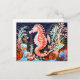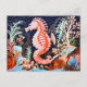 Artistic linocut of a delicate seahorse nestled among intricate coral formations. Bold contrasts and detailed textures showcase the beauty of underwater life in handcrafted style.